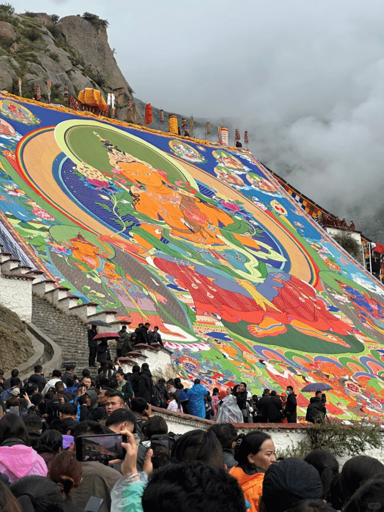 巨幅唐卡分別在寺院山坡上展開,晨光之中,誦經聲與人潮交織,這不是表演,而是藏人一年一次、集體走入信仰的真實現場,莊嚴而震撼。